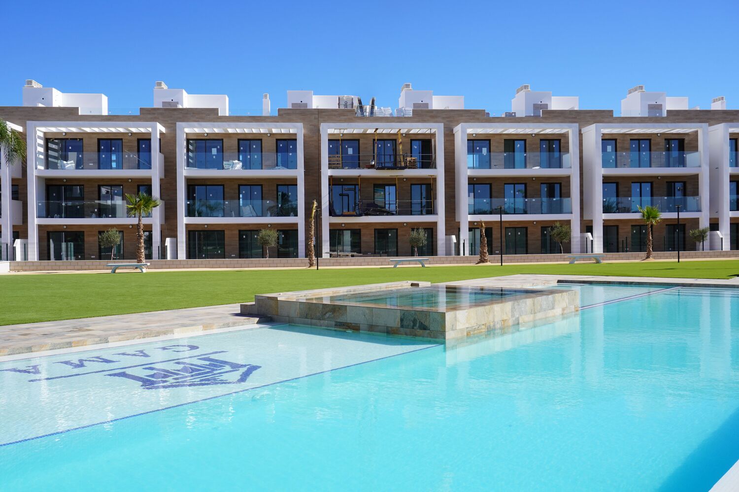 Toplocatie voor golf- en natuurliefhebbers, deze moderne Penthouses met een balkon van 18 m2 en een solarium van 56 m2 (Bij de 3 slaapkamers is het balkon 24 m2 en het solarium 68 m2). Voorzien van 2 of 3 slaapkamers en 2 badkamers waarvan 1 badkamer en suite. Door de gevelbekleding met houtnerftegels heeft het geheel een luxe uitstraling. De woningen met een bebouwd oppervlak van respectievelijk 88 m2 en 105 m2, afhankelijk van het aantal slaapkamers, bevinden zich op slechts 1 km van de zee en zijn geschikt voor zowel permanente bewoning als verhuur. Ze worden opgeleverd inclusief een parkeerplaats in de ondergrondse parkeergarage met 5-7 m2 berging voor oa fietsen. De parkeergarage is bereikbaar met de lift. De erg mooi aangelegde gemeenschappelijke ruimte met veel groen heeft 2 zwembaden waarvan het infinity zwembad prachtig zicht heeft over het golfresort. Naast het zwembad zijn toiletten en er is een ruimte met kinderspeeltoestellen.